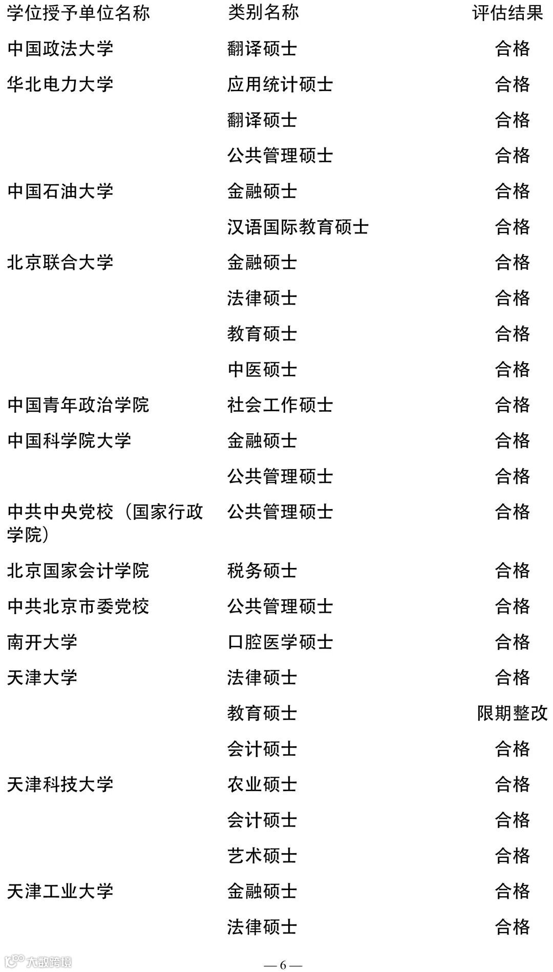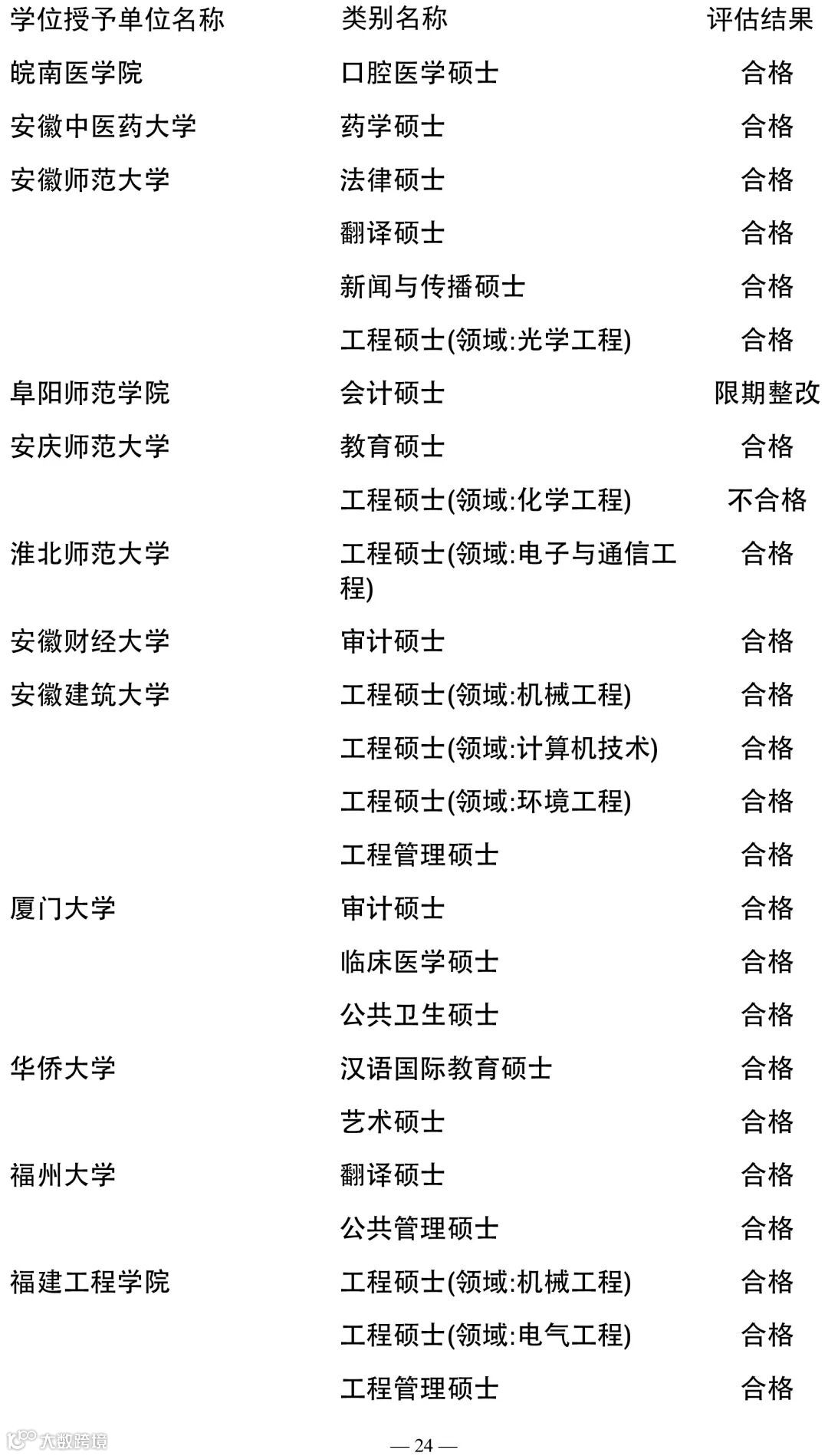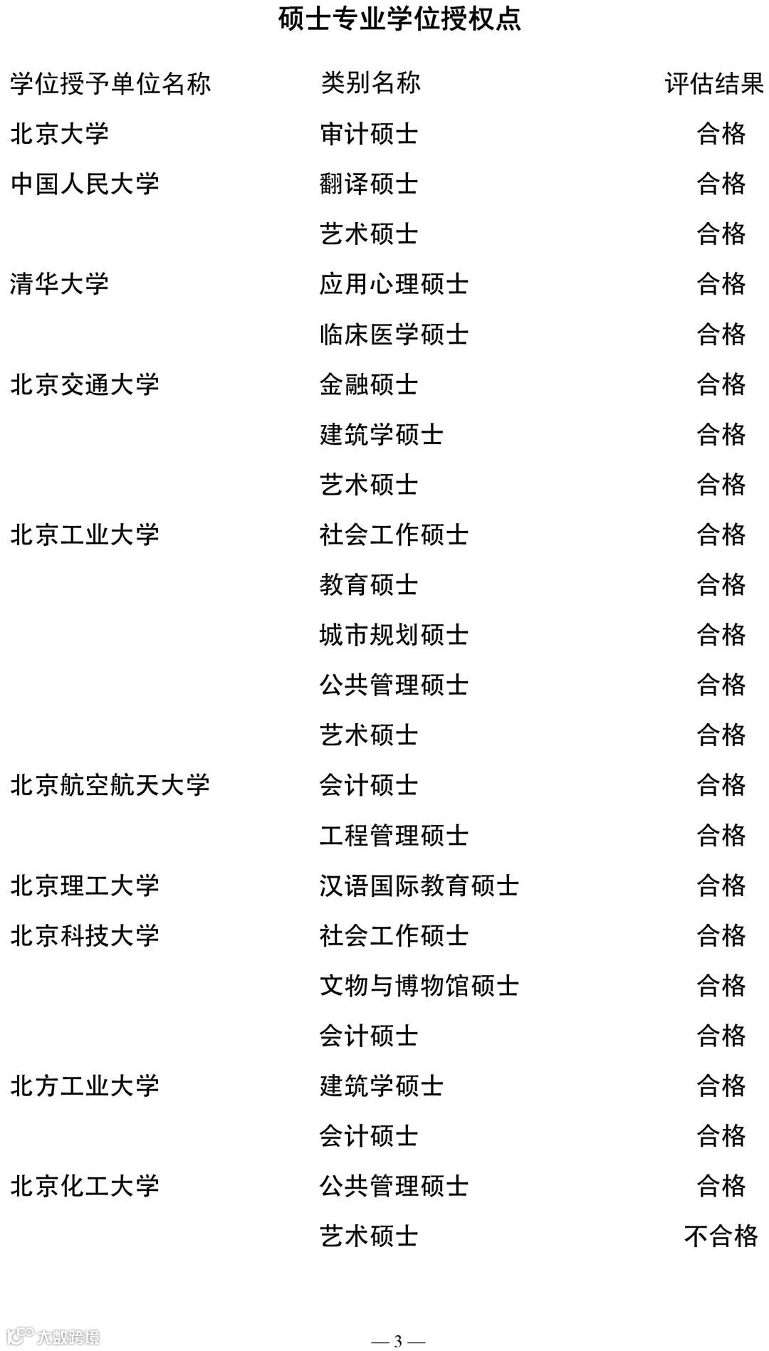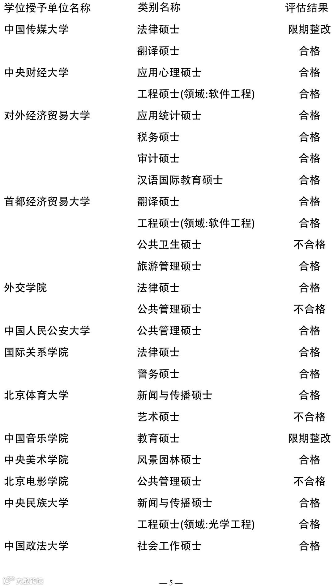 在硕士学位授权一级学科里,大连大学的设计学、安徽医科大学的生物医学工程显示不合格。其他硕士专业学位授权点中,包括北京化工大学艺术硕士、北京语言大学的工程硕士(领域:软件工程) 、北京电影学院公共管理硕士等在内的学科点被评为不合格。