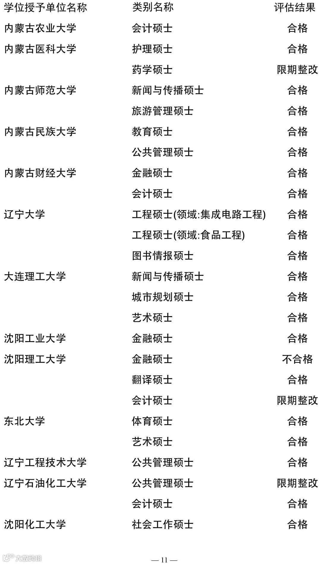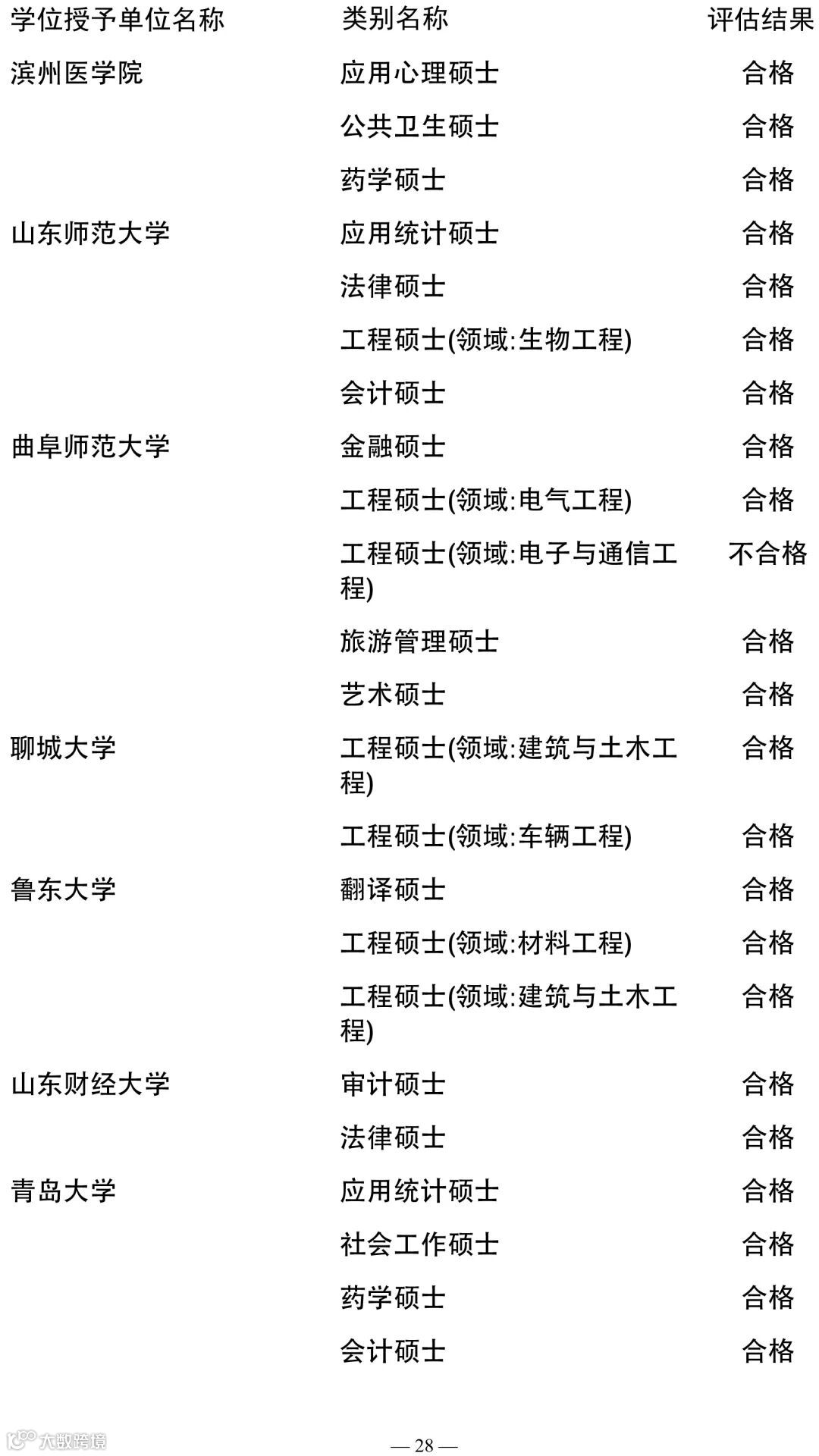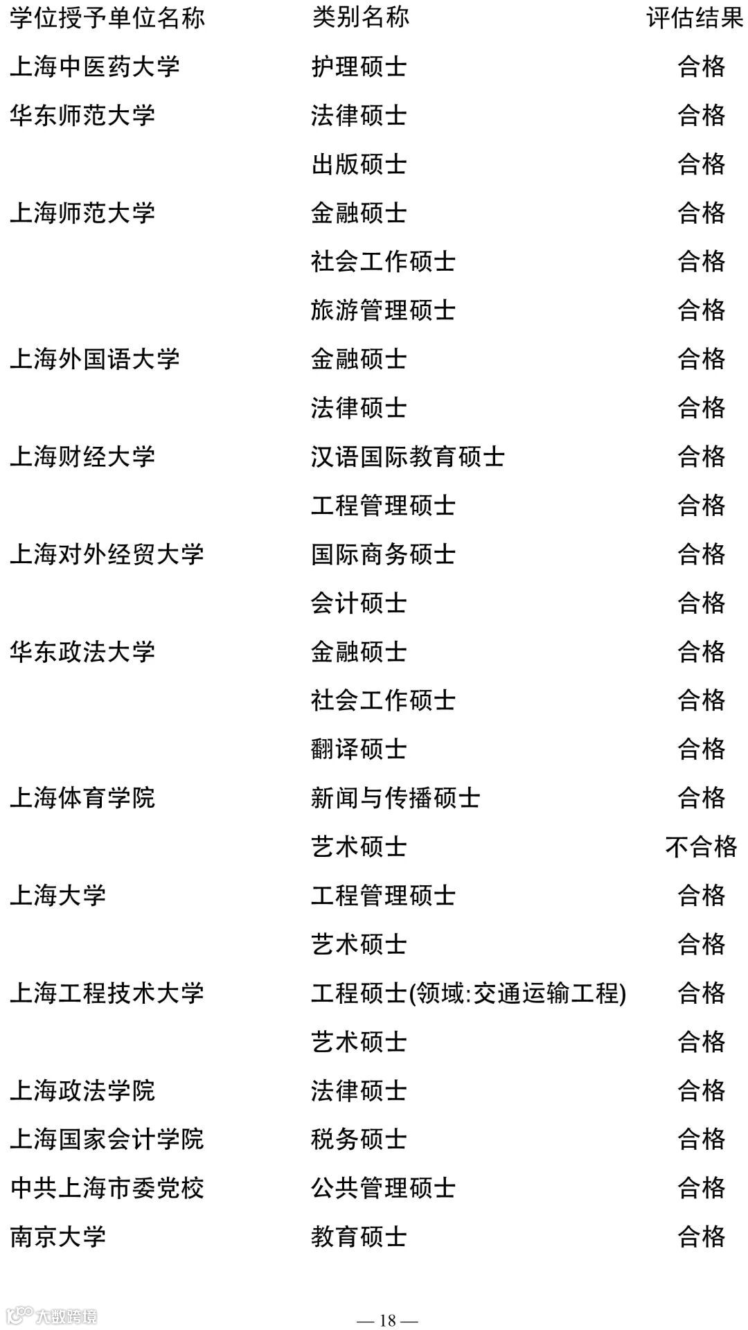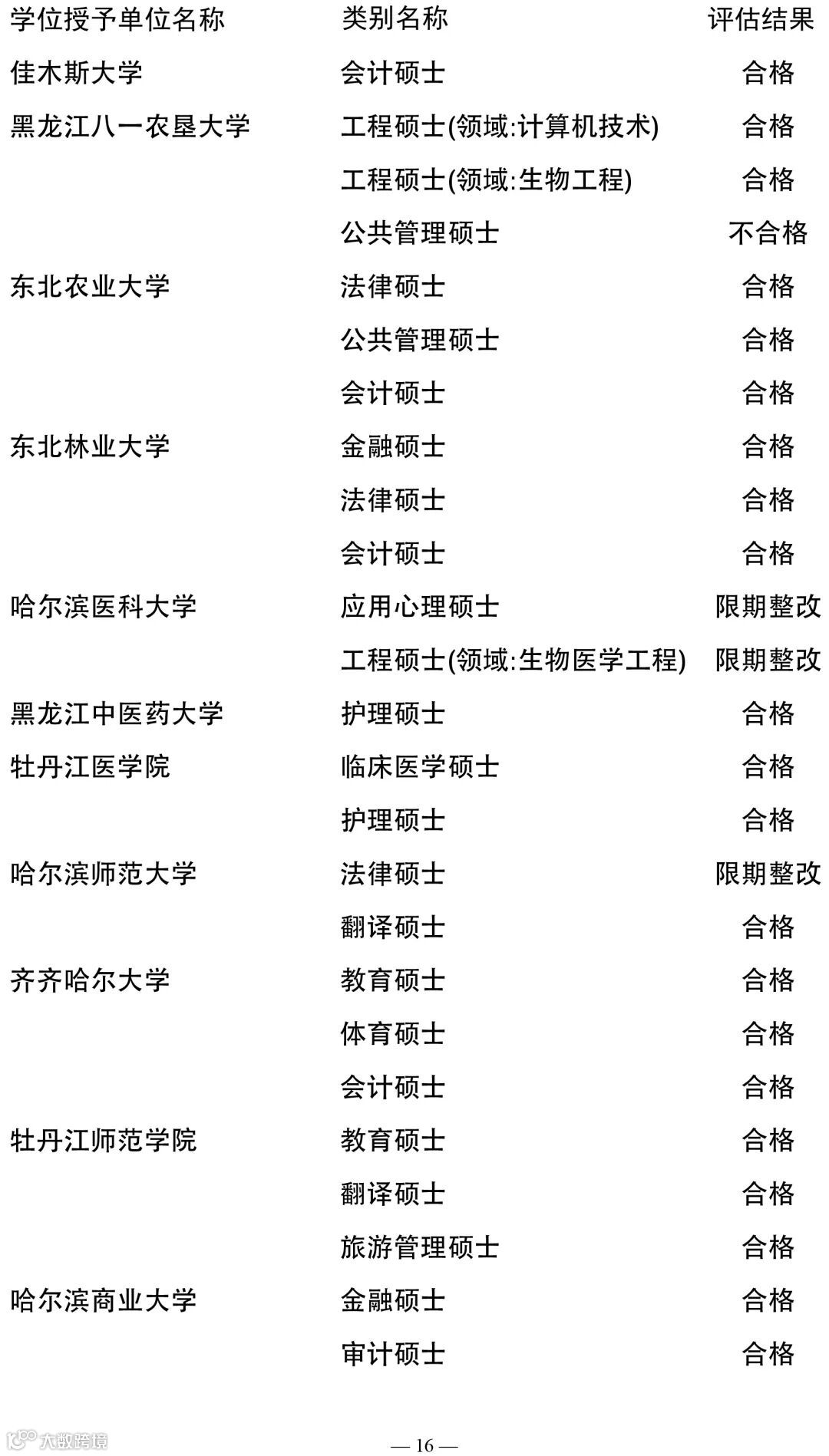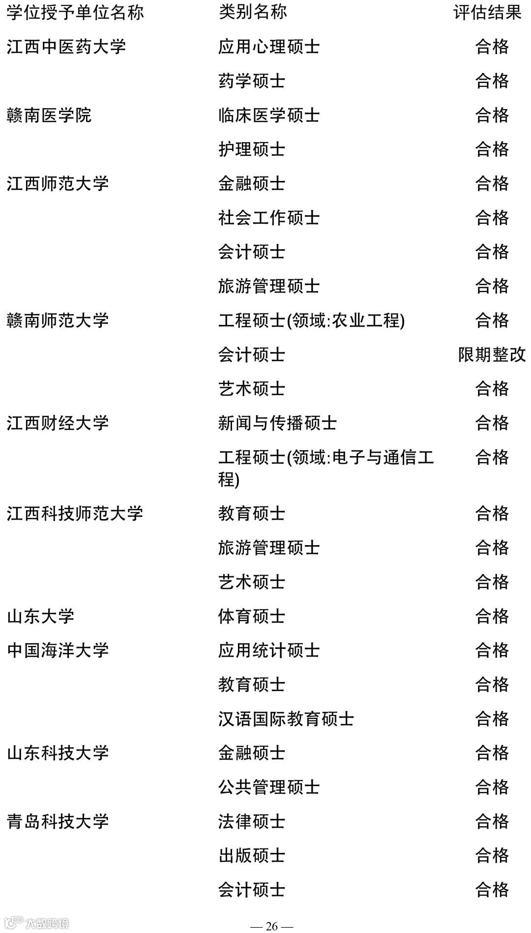 在硕士学位授权一级学科里,大连大学的设计学、安徽医科大学的生物医学工程显示不合格。其他硕士专业学位授权点中,包括北京化工大学艺术硕士、北京语言大学的工程硕士(领域:软件工程) 、北京电影学院公共管理硕士等在内的学科点被评为不合格。