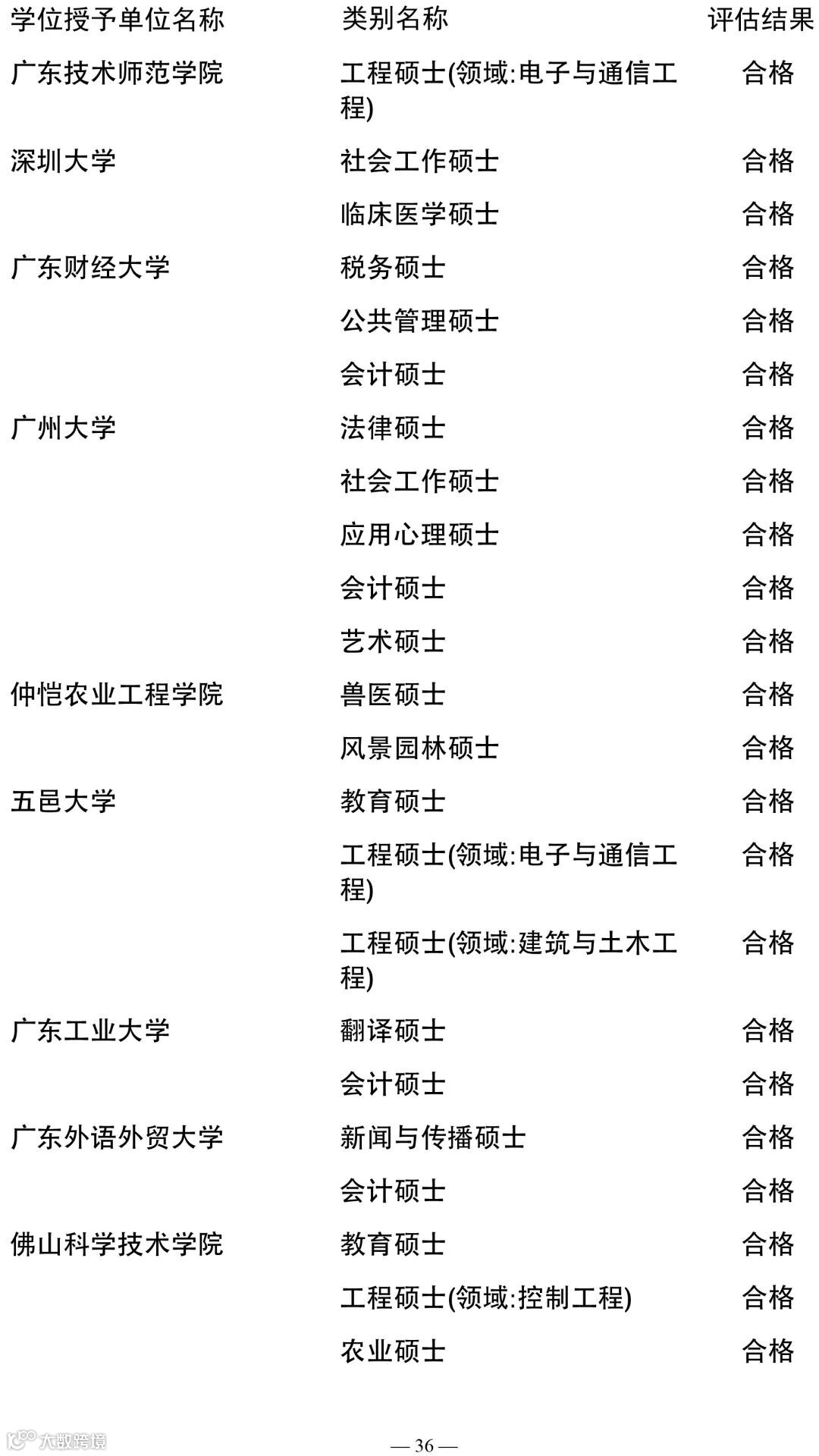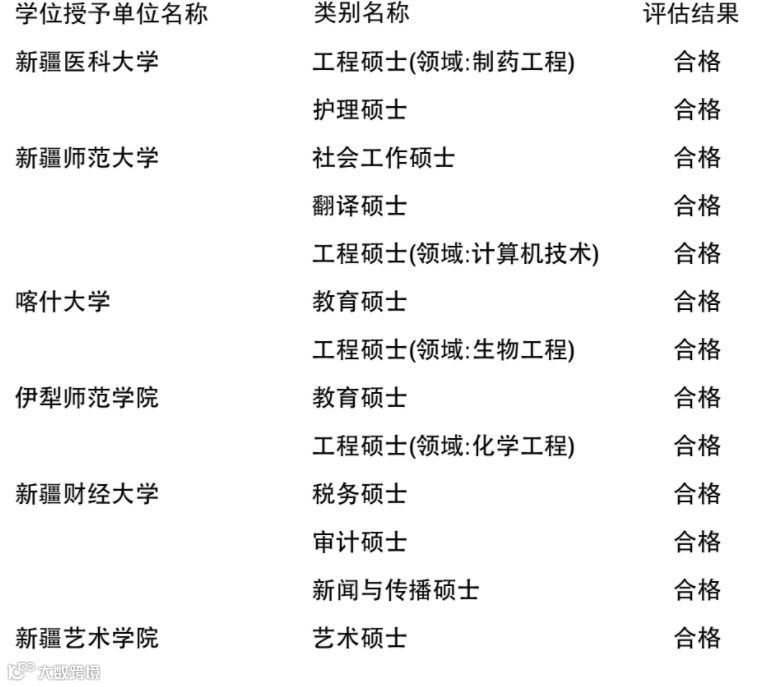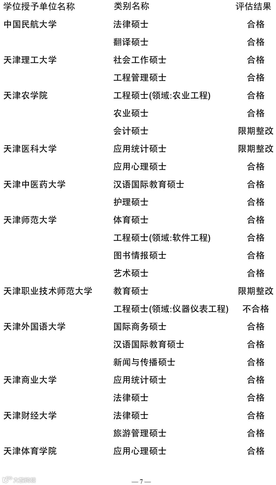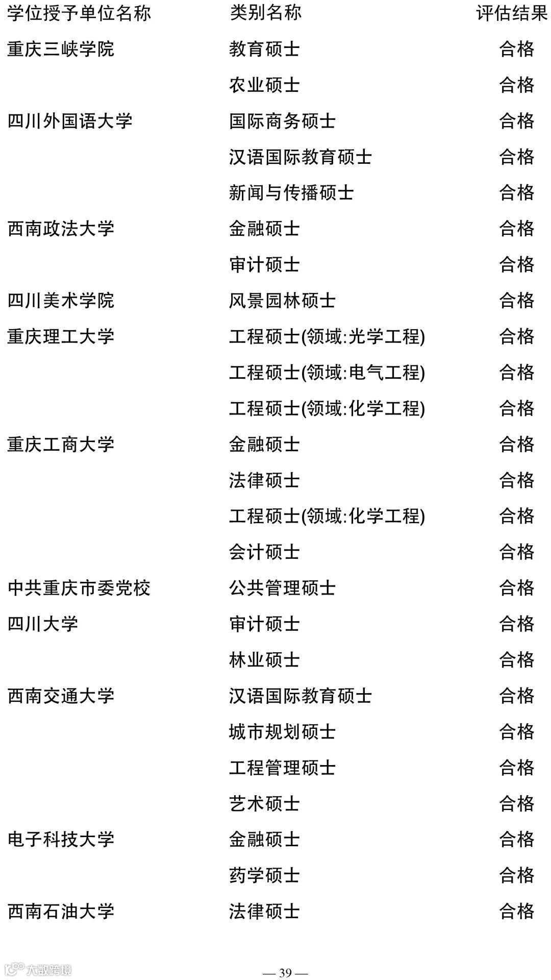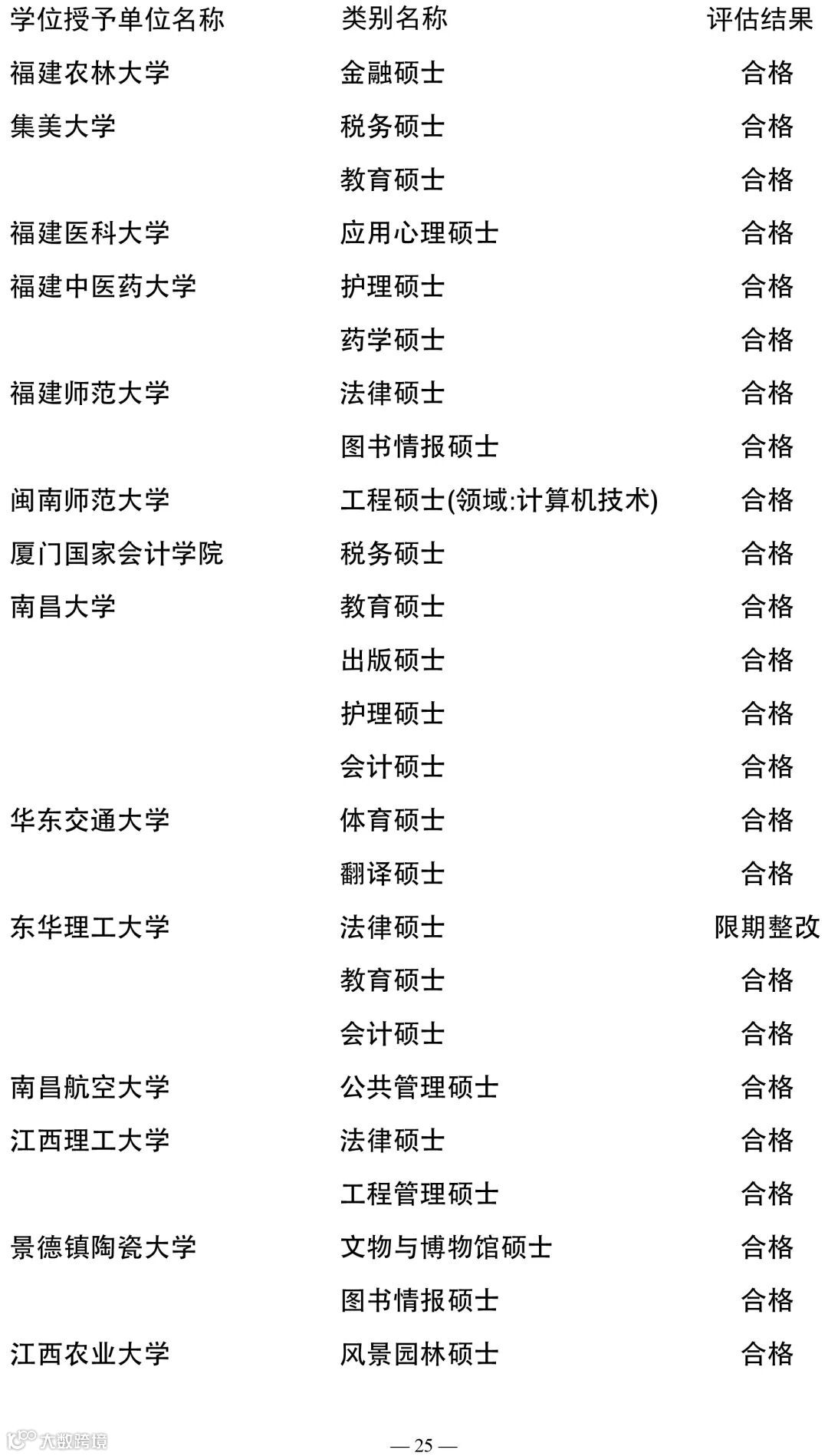 在硕士学位授权一级学科里,大连大学的设计学、安徽医科大学的生物医学工程显示不合格。其他硕士专业学位授权点中,包括北京化工大学艺术硕士、北京语言大学的工程硕士(领域:软件工程) 、北京电影学院公共管理硕士等在内的学科点被评为不合格。