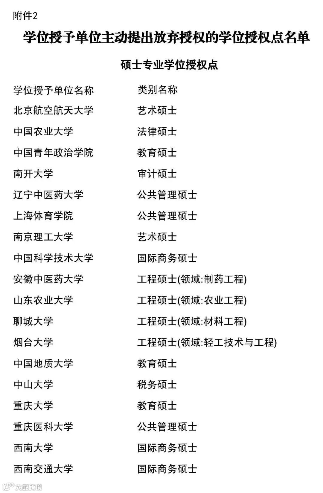 共有18所院校主动提出放弃18个学位授权点,包括北京航空航天大学放弃艺术硕士授权点、中国农业大学放弃法律硕士授权点、南开大学放弃审计硕士授权点。