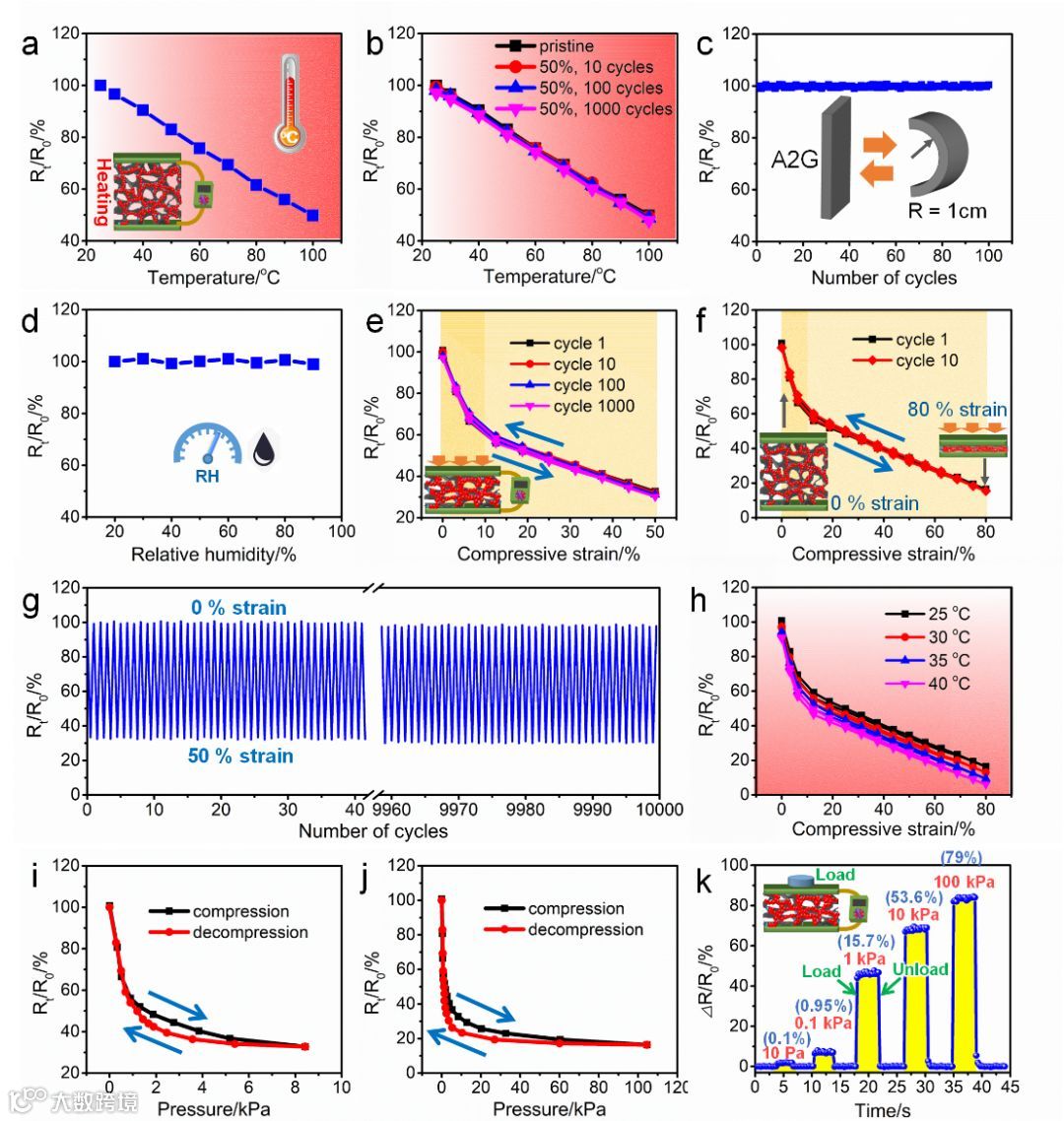 图4. 还原氧化石墨烯/聚有机硅氧烷气凝胶的温度、应变和压力传感性能。(a)电阻随温度的变化曲线。(b)抗压缩性能测试。(c)抗弯曲性能测试。(d)耐潮湿测试。(e,f)电阻随压缩应变的变化曲线。(g)气凝胶能够经受10000次50%的压缩循环。(h)不同温度下电阻随压缩应变的变化曲线。(i,j)电阻随压力的变化曲线。(k)气凝胶对不同压力和应变的响应。