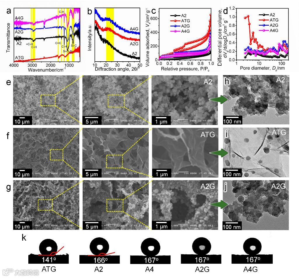 图2.(a,b)气凝胶的XRD和红外图谱。(c,d)N2吸附测试。(e-g)气凝胶的SEM照片。(h-j)气凝胶的TEM照片。(k)气凝胶的接触角。