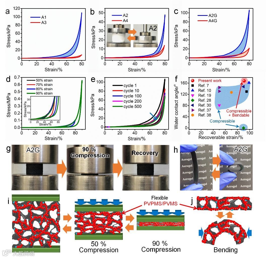 图3. 还原氧化石墨烯/聚有机硅氧烷气凝胶的柔性和弹性。(a-e)气凝胶的压缩应力-应变曲线。(f)同其它已报道的石墨烯基气凝胶接触角和可逆压缩应变的比较。(g)单轴压缩照片。(h)弯曲照片。(i,j)压缩和弯曲过程中结构变化示意图。