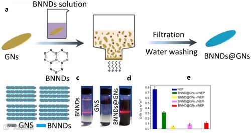 图1 (a)BNNDs在石墨烯表面的沉积过程,(b)BNNDs@GNs复合片,(c)BNNDs及石墨烯的分散行为,(d)改性石墨烯聚合物涂层的屏蔽性