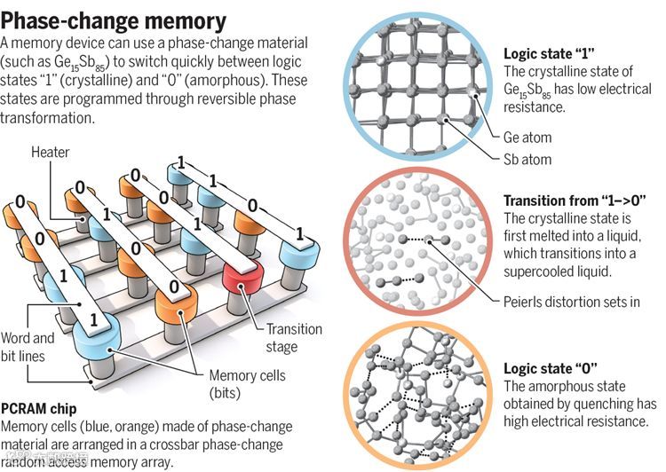 通过采用飞秒级同步辐射硬X射线衍射技术,Zalden等人发现AgInSbTe、Ge15Sb85两种典型的相变材料的过冷液相中存在一种LLPT,即短程序上存在Peierls distortion增大(原立方晶格八面体中六个较均一的化学键分裂为三长三短键),以及中程序上的相对应的化学键的长短调制。过冷液相在淬火过程中,经历此LLPT后,原子间电子局域化程度增强,致使液相体系更加粘滞(原子迁移受阻):即LLPT之前高温的脆性(fragile)液相转变为LLPT之后低温的刚性(strong)液相,证实此LLPT正是过冷液相动力学转变的结构诱因,发生了Fragile-to-strong crossover。这一发现揭示了相变存储材料高温高速晶化且低温数据非易失特性的物理本质,为设计性能更为优良的新型相变材料提供了强大的实验检验武器;有助于加快发展基于PCRAM的高性能通用型存储器与类脑神经元计算器件。