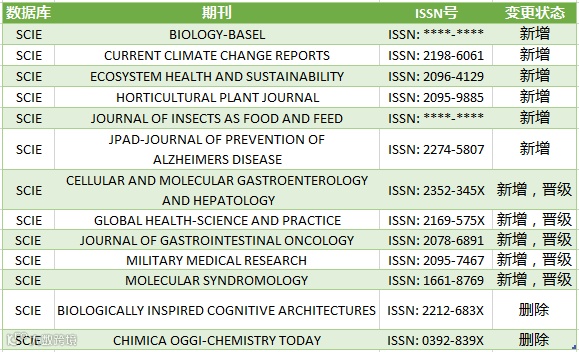 SCIE期刊数据库新增11种期刊,删除2种期刊(详见表1)。当前,SCIE期刊数据库共有9,200种期刊。
