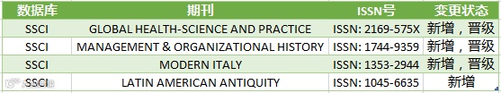SSCI期刊数据库新增4种期刊(详见表2)。当前,SSCI期刊数据库共有3,408种期刊。