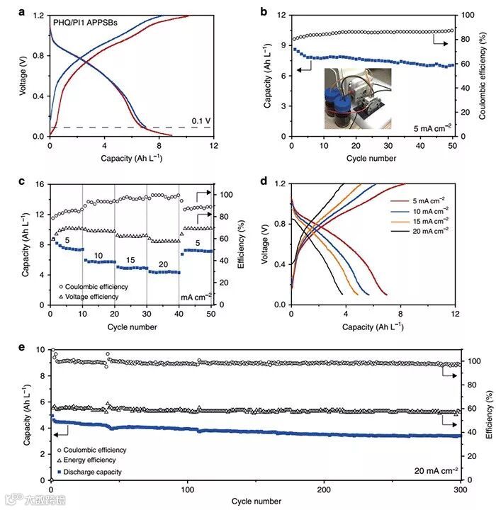 另一方面,该研究中用生物化学实验中常见的透析膜替代质子交换膜作为电池隔膜,利用透析膜的尺寸排阻效应,有效阻止了正极和负极活性物质的交叉污染,保证了电池的循环稳定性,并能够促进充放电过程中氢离子的快速传递(图4)。通过详细研究不同粒径的聚合物微粒对电化学性质及电池性能的影响,证明当高分子微粒的尺寸由几微米(2-5 μm)减小到几百纳米(500 nm)时,其微粒扩散和电荷传递得到提升,法拉第电流增大,电池测试中的活性物质容量利用率也随着微粒尺寸的减小而增加。