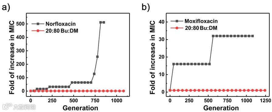 图2. β-多肽聚合物 20:80 Bu:DM和抗生素对(a)金黄色葡萄球菌和(b)铜绿假单胞菌的耐药性测试