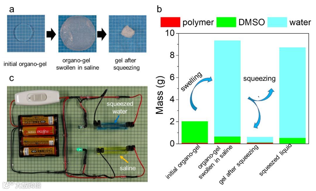图3 有机凝胶的海水淡化的效果演示。(a)有机凝胶在溶剂交换前、盐水中溶剂交换后及经挤压后的照片,其化学组成如图(b)所示。(c)凝胶挤出的液体(上)及溶剂交换介质(盐水,下)的导电性能比较。