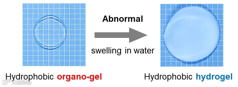 听起来有些痴人说梦,而最近北海道大学龚剑萍教授课题组就实现了这种由疏水的高分子做成的水凝胶,并且具有极高的水含量(最高99.6%,即4 g高分子承载了1000 g水,远超传统的水凝胶材料)。这种神奇的材料是怎么做的呢?