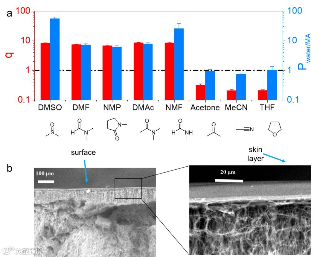 图2 (a)PMA在不同有机溶剂中的凝胶在水中的体积变化(红色)和有机溶剂对水和单体的亲和度之比(数值越高表明和水的亲和能力越强)。(b)DMSO类有机凝胶在水中溶胀后的表层SEM照片。