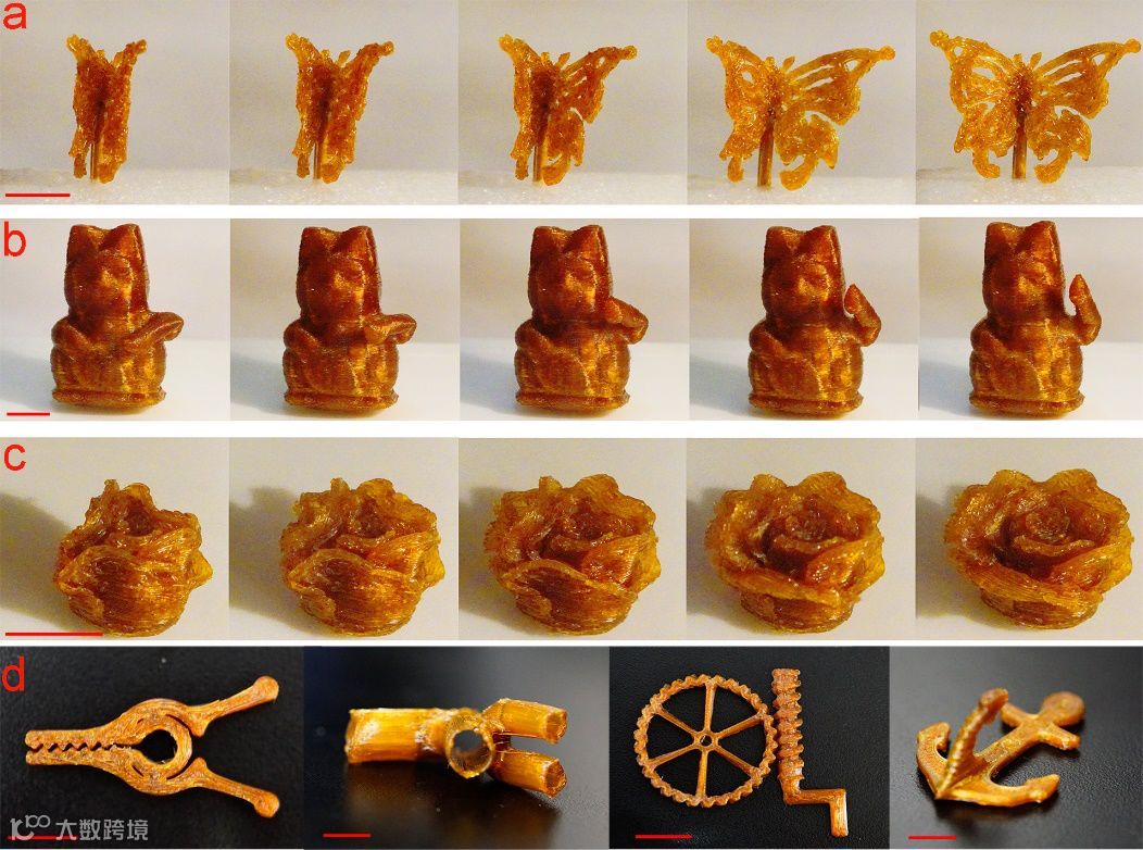 PET共聚酯由于合适的结晶速率、可控的熔体流变性和较强的层间黏附力,可用于3D打印技术制备不同形状的几何模型,且制备的3D模型具有很好的形状记忆性能,可望制备大规模的可折叠-展开设备并用于航空航天和交通运输等领域。