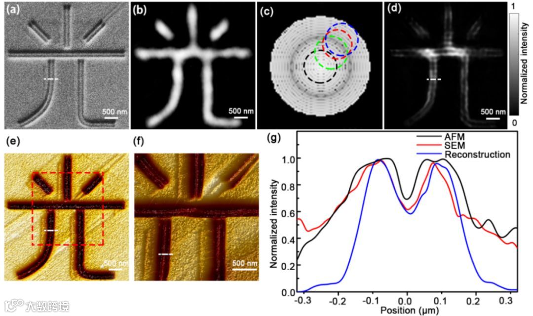 图·2. a. 汉字“光”的SEM图,刻槽中心间距为146 nm;b. 汉字“光”的垂直照明图;c. 汉字“光”的频谱拼接图;d. 汉字“光”的远场重构图;e. 汉字“光”的原子力显微镜图。f.对应图e中红色虚线框内的原子力显微镜放大图;g. 沿图2a,d,e中对应虚线位置处的轮廓曲线图。
