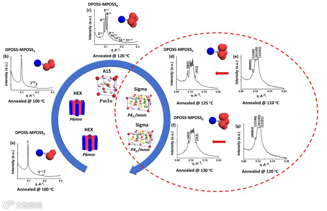 在此研究中, 一系列ABn型巨型分子通过将一个亲水polyhedral oligomeric silsesquioxane (POSS)纳米粒子与不同数量的疏水POSS 纳米粒子精确相连而成。通过调节同一个巨型分子中疏水POSS的数量(n=2-6),巨型分子会形成不同的超分子组装结构 (包括六方紧密堆积柱状结构(HEX), Frank-Kasper A15相,Frank-Kasper σ相)。更为有意思的是,AB5型巨型分子(一个亲水POSS纳米粒子连接5个疏水POSS纳米粒子)以及AB6型巨型分子 (一个亲水POSS纳米粒子连接6个疏水POSS纳米粒子) 在低退火温度下可以形成十二重对称准晶相(Dodecagonal quasicrystal, DQC), 而在高退火温度下可以形成Frank-Kasper σ相(图一)。