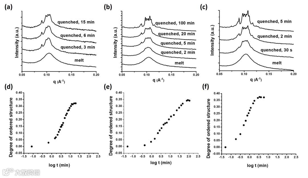 图二 基于SAXS的AB5型巨型分子相形成过程的动力学研究。样品由熔融无序状态下(150 °C)淬火到不同温度(a) 110 °C, (b) 118 °C, (c) 125 °C后在不同退火时间对样品结构的SAXS检测。样品由熔融无序状态下(150 °C)淬火到不同温度(d) 110 °C, (e) 118 °C, and (f) 125 °C后,样品结构有序度与退火时间的关系。