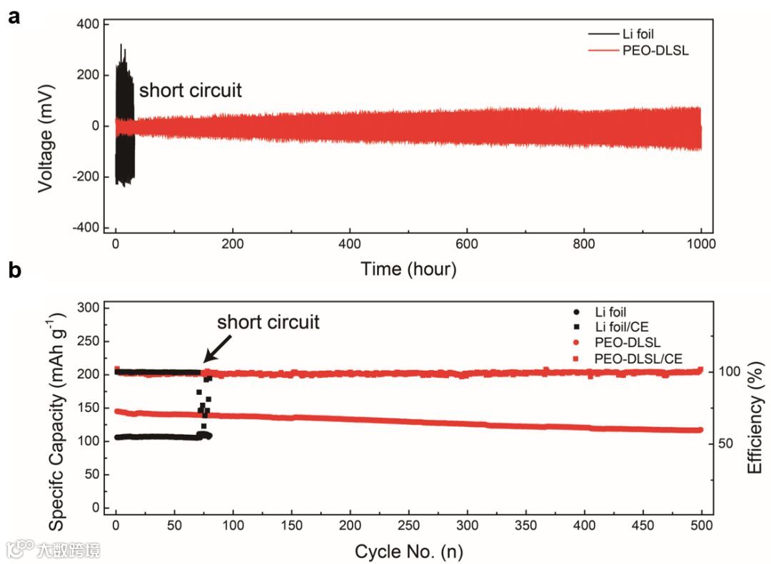 以PEO-SPE作为固态电解质,PEO-DLSL对称电池在锂脱出/沉积测试中可稳定性循环超过1000小时不短路,同时极化电压可以保持在100毫伏以下。而传统的锂箔负极表现出很高的极化电压(200毫伏以上)并且在循环50圈后就发生了短路(图2a)。研究人员进一步考察了PEO-DLSL在全固态锂金属电池(PEO-SPE为固态电解质,磷酸铁锂为正极)中的性能,如图2b所示,基于PEO-DLSL的固态锂金属电池表现出非常好的循环稳定性(0.5C倍率下可循环500圈,容量衰减速率为0.04%/每圈),而采用平板锂箔的固态锂金属电池在循环75圈后即发生了短路(图2a)。