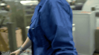 先要根据式样切割布料。这个布料切割机可以切穿150-200层牛仔布。所以工人要带上这种专业的金属手套保护手指。
