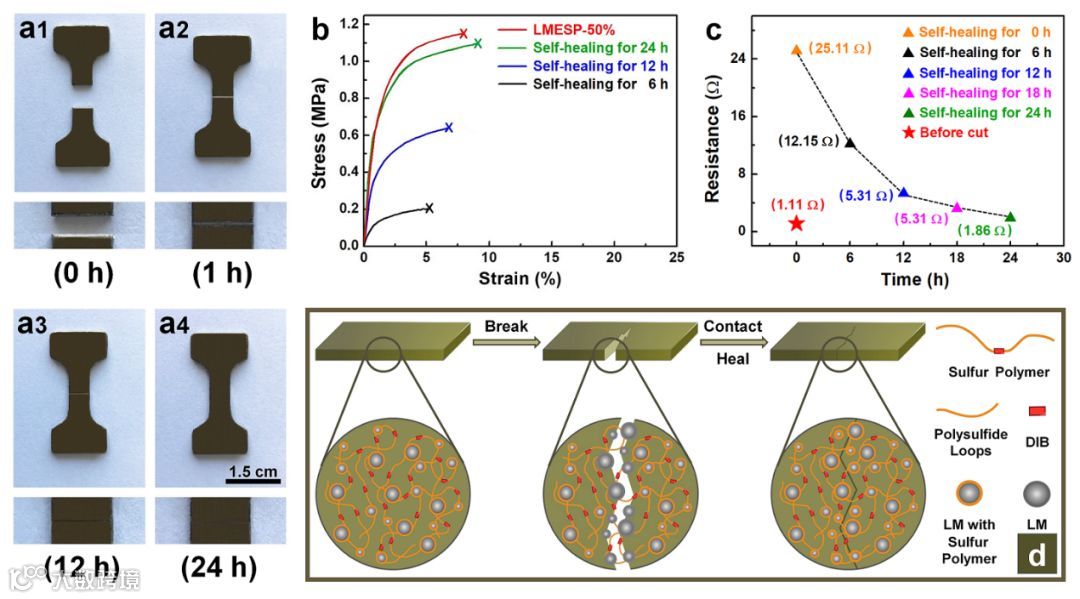 图2.(a)用于自愈试验的LMESP-50% LM样品的照片。将样品切成两半,然后在室温条件下接触来实现自愈合。下图是切割样品的局部放大图。(b)LMESP-50% LM样品以及经过6小时,12小时和24小时自愈后的应力-应变曲线。(c)LMESP-50% LM样品以及经过0小时,6小时,12小时,18小时和24小时自愈后的电阻值。(d)LMESP材料自愈性质的机理图。
