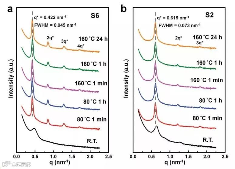 图 2. 嵌段聚合物在不同时间和温度退火后自组装的小角X射线散射图