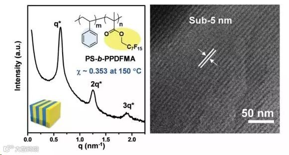 图 1. Sub-5 nm嵌段聚合物结构及其相应的SAXS,TEM表征
