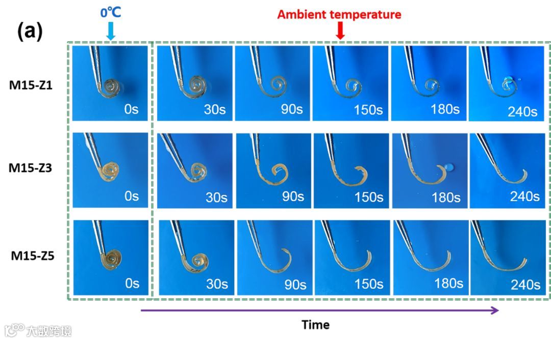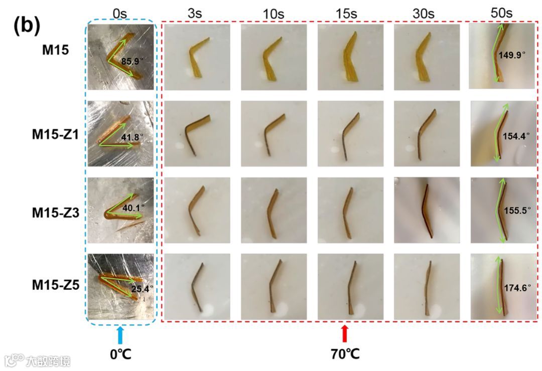 Zn2+盐键的形成同时也使得SBS-g-COOH/ZnO的玻璃化转变温度有了大幅提升(-1.3~11.6℃),而且Zn2+盐键是一种具有温度适应性的动态非共价键,在两种因素的作用下赋予了材料形状记忆效应。