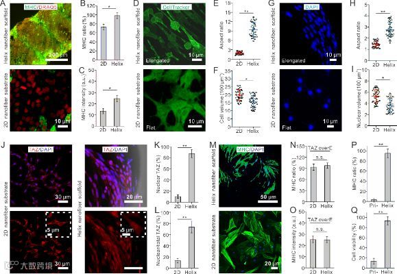 作者发现材料表面的多尺度周期性拓扑结构不但可以改变细胞的物理特性,如细胞的成活率、体积、取向、生长脱落,同时还可以通过调控细胞种类及特定转录因子向细胞核的运输,诱导充间质干细胞朝肌肉细胞的定向分化(图2)。作者认为,此类多尺度螺旋纤维材料在未来有望用于组织器官修复替代品,如韧带肌腱组织等。