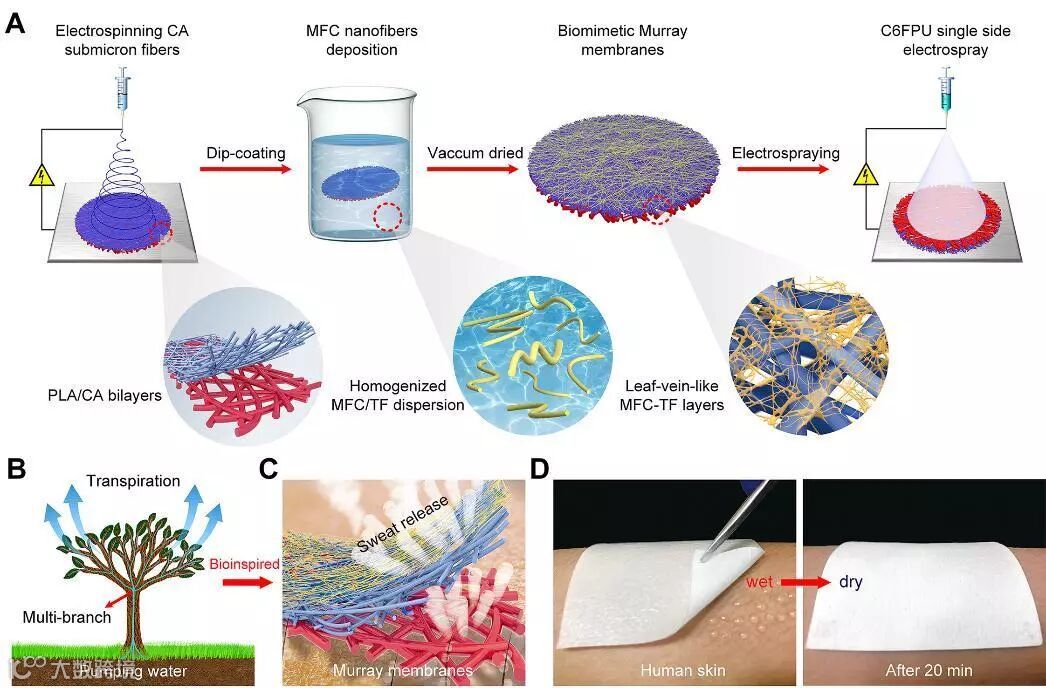 近日,东华大学纺织科技创新中心俞建勇院士及丁彬研究员带领的纳米纤维研究团队在吸湿快干功能纺织品领域取得重要进展,相关成果以《基于仿生多孔Murray纤维膜的吸湿快干功能性面料》(Biomimetic Fibrous Murray Membranes with Ultrafast Water Transport and Evaporation for Smart Moisture-Wicking Fabrics,