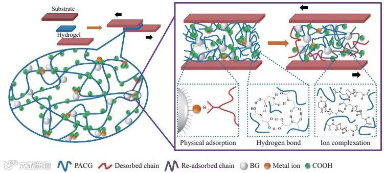 图1 PACG-BG纳米杂化水凝胶黏附机理图