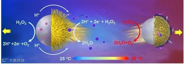 针对这一难题,该研究团队首次在金-铂双金属阴阳马达的金侧原位生长了热敏聚异丙基丙烯酰胺(PNIPAM)高分子刷。当温度为25℃,金表面的高分子刷链是伸展和亲水状态,允许物质在高分子刷内的自由扩散和表面反应的进行,胶体马达以8.5μm/s的速率沿Au-Pt方向运动,驱动机理为自电泳;当温度上升至35℃,高分子刷链是塌陷和疏水状态,马达以2.3μm/s的速率沿Pt-Au方向运动,驱动机理为自扩散泳。这种周围环境温度变化引起高分子链构象的可逆转变导致马达自推进方向和速率相应改变的策率,有望使合成胶体马达感知周围环境变化(如温度)而进行趋向或远离目标源的自主运动,展现类似游动细菌趋向性的智能行为,对未来新型微纳米机器的开发与应用具有重要的意义。