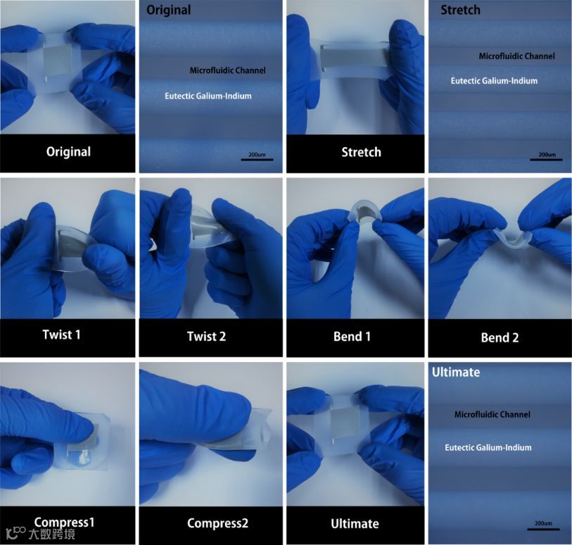 为此,该课题组成员提出了一种基于微通道的优化设计、利用液态金属制备的柔性可拉伸传感器的方法。研究团队利用有限元仿真优化结果,设计制备柔性可拉伸传感器,实验结果表明该柔性传感器可在590%的拉伸,270o扭转和180o弯曲的情况正常工作。当拉伸550%,灵敏度GF可达4.95,拉伸重复率误差<0.1%,为实现人体手指、手腕等关节等运动精准测量提供了可行性方法,充分展示了其在柔性可穿戴电子设备领域的良好应用价值。
