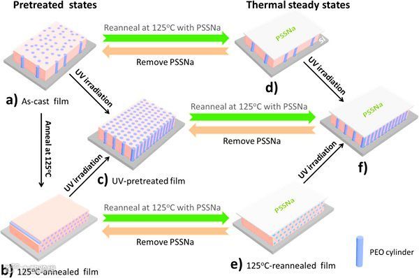图LCBC薄膜(a)中形成的MPS纳米结构的热稳定性的示意图,预处理薄膜在125℃退火(b),并暴露于UV辐射(c);由顶部涂层PSSNa获得它们的相应稳定性(d-f)