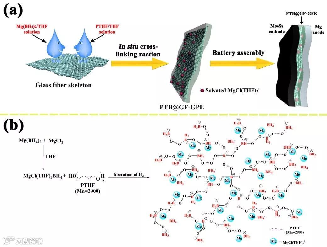 基于以上研究背景,依托青岛能源所建设的青岛储能产业技术研究院通过硼氢化镁与聚四氢呋喃端羟基的原位交联反应,在玻璃纤维骨架上构建了一种能够可逆地沉积溶解镁的凝胶聚合物电解质体系。该凝胶电解质表现出高的镁离子迁移数(0.73)和高的室温离子电导率(4.76×10-4 S/cm)。而装配该凝胶电解质体系的Mo6S8/Mg电池不仅能在宽温区(-20-60 ℃)内正常工作,而且展现出优异的安全性能。这种原位交联的方法为镁电池聚合物电解质的进一步开发提供了一种十分有应用潜力的策略。