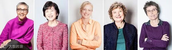 从左至右依次是: (左1)纳吉特-奥朗-萨利巴(Najat Aoun Saliba)教授,(左2)川合真纪教授,(左3)凯伦-哈尔伯格(Karen Hallberg)教授, (右2)英格丽-多贝西(Ingrid Daubechies)教授 ,(右1)克莱尔-瓦赞(Claire Voisin)教授
