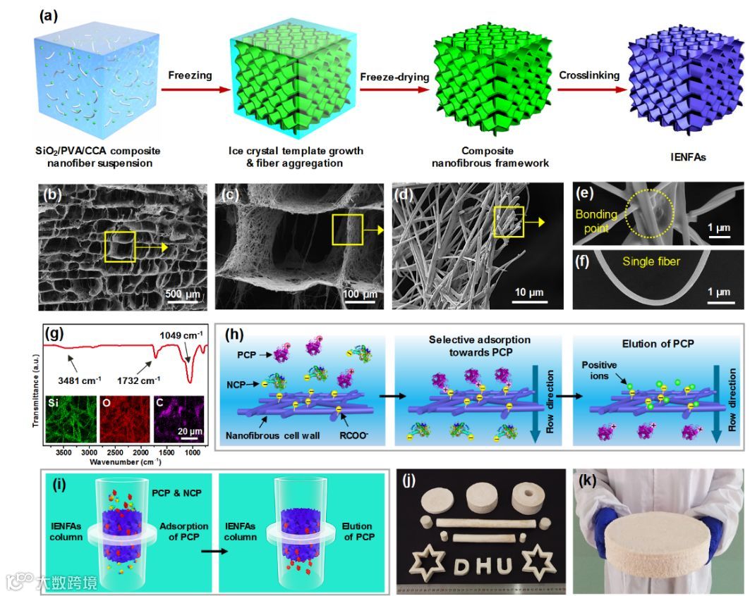 离子交换纳米纤维气凝胶的构筑过程、理\化结构及蛋白质分离应用示意图
