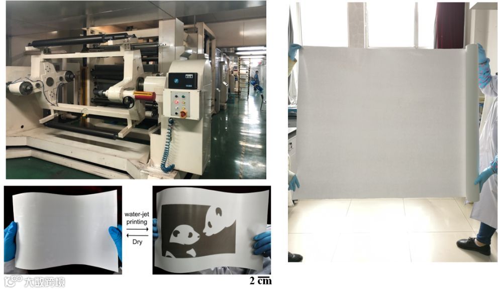 为了快速推进无墨喷水打印技术的产业化进程,早日实现产品市场化推广,张晓安科研团队与中国航天科技集团公司旗下的乐凯医疗科技有限公司从2016年5月便开展了深度合作。借助乐凯医疗科技有限公司在涂布方面的优势,实现了基于高强度、强耐水性的水致变色可重复擦写纸的制备,显著地提高了纸张循环使用性能,并可以实现大规模的机器化生产(图3)。