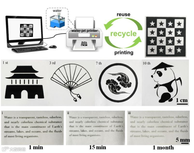 无墨喷水打印技术是以水代墨实现打印的技术,核心技术是打印纸,它具有水致变色可重复擦写性质,从而实现了纸张的循环使用。