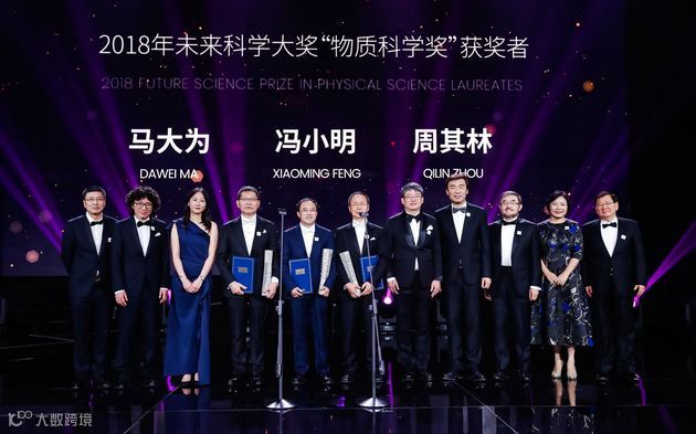 马大为、冯小明、周其林获得2018年未来科学大奖-物质科学奖。鲍哲南,丁洪,毛淑德作为科学委员会,邓峰,吴亚军,吴鹰,徐小平作为捐赠人为获奖者颁奖。