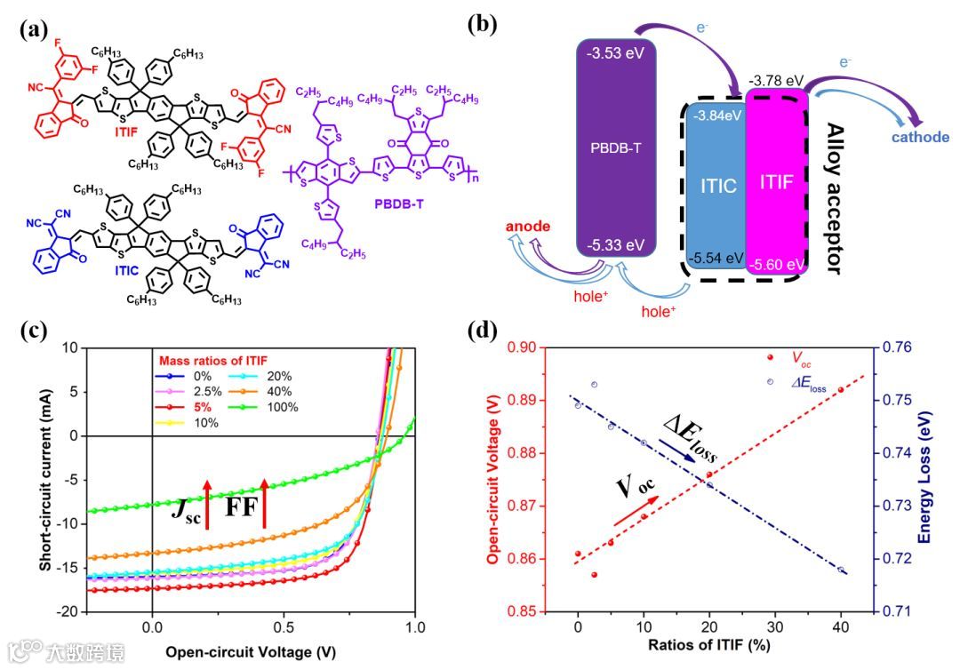 图1. (a) 给体PBDB-T以及受体ITIC与ITIF的结构式;(b) 基于PBDB-T:ITIF:ITIC的三组分太阳能电池工作示意图;(c) 基于PBDB-T:ITIF:ITIC的三组分太阳能电池J-V曲线图;(d) 不同浓度下光伏器件开路电压以及相应能量损失图。