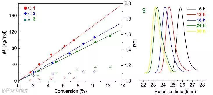 图3. 活性共聚转化率与分子量关系以及产物GPC曲线