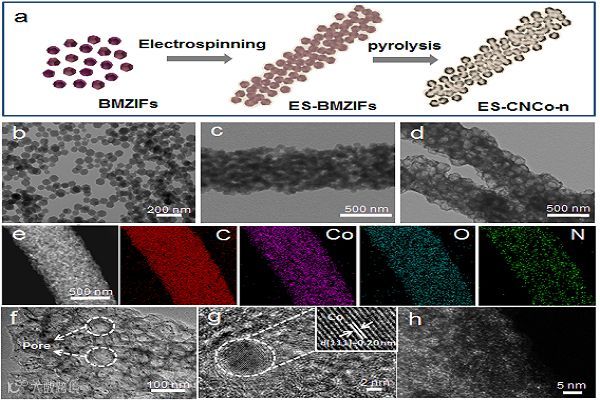 近日,合肥工业大学化学与化工学院张传玲副教授研究组利用静电纺丝技术实现了双金属沸石咪唑啉框架纳米颗粒(BMZIFs)的组装,并进一步制备出了兼具高催化活性和稳定性的Co/N掺杂多孔碳纤维电催化剂。相关成果以“Electrospun metal-organic framework nanoparticle fibers and their derived electrocatalysts for oxygen reduction reaction”为题,发表在爱思唯尔出版社著名期刊《纳米能源》上(Nano Energy 2018, 55, 226-233)。