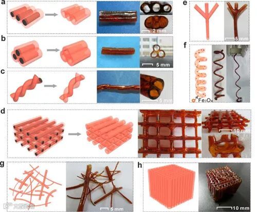 随后,基于水凝胶材料成型较难的现实和复杂结构水凝胶管简易制备的技术需要,研究人员又通过化学聚合成功制得复杂结构三维水凝胶管材料。他们发现当以铁丝或棒状含铁复合材料作为生长模板时,移除模板后可获得中空水凝胶管。利用此方法,研究人员拓展了凝胶管的化学组分,成功制备得到了8至9种不同化学组分的水凝胶管材料。通过使用多根铁丝作为生长模板,可制备得到具有复杂结构的三维水凝胶管材料(图2)。