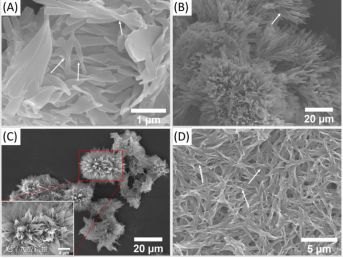 图2. Trans-C5-Chol在不同溶剂体系里形成的凝胶的扫描电镜图:(A) DMF, (B) acetone, (C) EA, (D) DCM/EA (1/2, v/v)