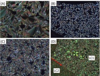 图1. Trans-Cn-Chol从高温的各向同性相降温到液晶相时,通过偏光显微镜观察到的织构:(A) trans-C0-Chol, 25 °C; (B) trans-C1-Chol, 25 °C; (C) trans-C3-Chol, 25 °C; (D) trans-C5-Chol, 145 °C (LC2相开始从左边增长)