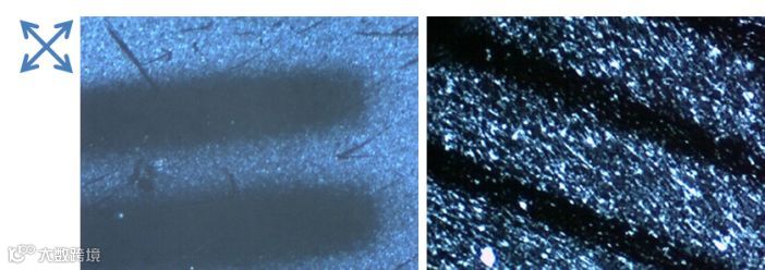 图3. 紫外光通过条形模板照射Trans-C1-Chol的薄膜(on a PVA-treated glass plate)后得到的偏光显微镜照片。黑区为照射区。 (A) trans-C0-Chol,mask 1 (width of strip: 100 μm; distance between two stripes: 200 μm). (B) trans-C1-Chol,mask 2 (width of strip: 50 μm; distance between two stripes: 200 μm).