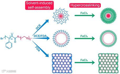 吉林大学乔振安教授课题组设计合成了两亲性嵌段共聚物聚乙二醇-聚苯乙烯(PEO-b-PS),通过溶剂诱导嵌段共聚物自组装的方法合成了具有多级孔结构的超交联聚合物。与前人的工作不同,该方法创造性地把模板剂与前驱体结合在一起,用嵌段共聚物PEO-b-PS在甲缩醛与1,2-二氯乙烷混合溶剂中形成的胶束作为反应的“单体”,通过交联反应将不稳定的胶束转化为稳定的超交联聚合物。而通过调节胶束的组装状态,就可以改变所得到产物的形貌。
