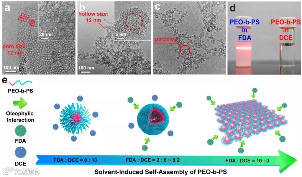 图2 a. 当FDA:DCE体积比为10:0时产物的TEM照片 b. 当FDA:DCE体积比为2:8时产物的TEM照片 c. 当FDA:DCE体积比为0:10时产物的TEM照片 d. PEO-b-PS在不同溶剂中形成的体系的照片 e. 溶剂诱导自组装法的机理示意图