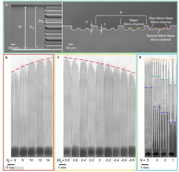 研究团队还通过光刻技术制造出相应的仿生微纳结构(图3),验证了微纳高低棱结构的高速液体传输性能,并基于Lucas-Washburn原理、Onsager原理与边界滑移理论分别建立了两种传输模式的理论模型。进一步揭示了高低棱多级微纳结构参数对超高速传输的影响规律,提出超高速输送高低棱结构仿生设计准则。