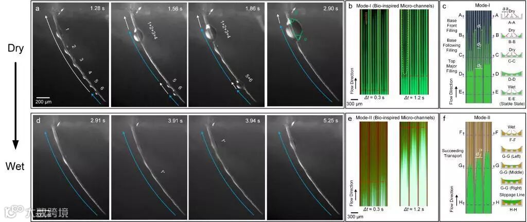 研究团队深入分析了绒毛的表面微观结构特征,首次发现了特殊的高低棱多级微纳沟槽结构,即相邻高棱间分布3~5个低棱(图1)。在此高低棱多级微纳沟槽结构上,液体在表面干湿状态下会相继出现两种不同的输送模式。当多级微纳表面结构处于干燥状态时,液体传输主要依靠固-液接触产生的毛细力,此时液体传输模式与仙人掌刺、蜘蛛丝相类似,表现为大液滴移动方式,即传输模式I(图2a-c)。由于高低棱沟槽结构产生的毛细力呈梯度分布,传输模式I下的液体传输速度也不尽相同,呈现出快、慢速度梯度。而当高低棱沟槽结构润湿后,一层稳定的水膜会维持在表面上,降低三相接触线,避免后续液体与绒毛固体表面直接接触,液体传输动力就变为液-液接触的超滑毛细力,显著降低后续液体传输阻力,加速了后续的液体传输,即传输模式II(图2d-f)。