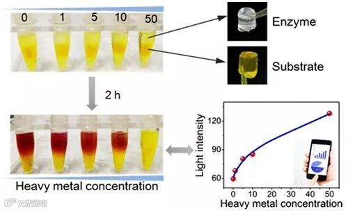 此外,研究人员还设计了一种利用生物酶进行重金属离子毒性评估的方法。由于重金属离子对该生物酶具有明显的抑制作用,所以通过酶促显色反应实现了水样中重金属离子的总毒性评估。利用水凝胶对生物酶进行了包埋,不仅提高了生物酶的储存时效,还进一步简化了实际检测的操作步骤。